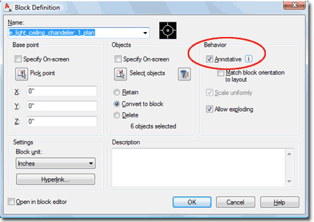 Problem To make a Block Annotative, you simply have to set the "Annotative" checkbox under the Behavior section of the Block Definition dialog - see image right. I make note of something this obvious because I know how easy it is to miss this option and what a pain it can be to figure out how to activate the Annotative "behavior" after having created a Block - see below. |