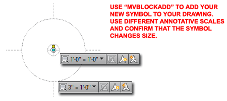 Proof After creating the MvBlock, it's a good idea to test it and see if the size changes correctly as the Annotative Scale is changed. Always Add your custom MvBlocks at the 1:1 or 1'-0"=1'-0" scale and check that the size is correct for a 1:1 print. |