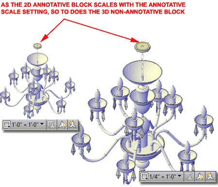 The Proof When I tested the new MvBlock definition I discovered, with great horror, that the 2D Annotative Block was scaling the entire MvBlock when the Annotative Scale value was changing. And, that's not the whole story. If I viewed the MvBlock in a Model View, like Isometric, and changed the Annotative Scale value, nothing changed. When I viewed the MvBlock from the Top or Plan View, the 2D Annotative Block was not the correct size for the the current Annotative Scale because it wasn't visible in the Model View. |
