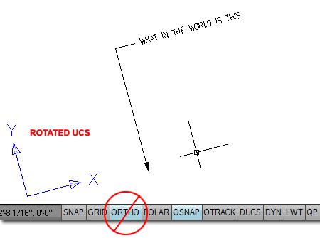 MLeader Bug #2 MLeaders don't like Ortho when the UCS is not set to World. If you Rotate your UCS icon and attempt to draw an Mleader with Ortho On, you should find that it shoots off into space. If you adjust your model view to match the current UCS, typically by using the "Plan" command, the problem persists. I guess the good news is that it works fine when Ortho is turned Off. And, most leaders are drawn at low angles rather than orthogonally, right?