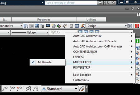 A new menu with that missing toolbar Illustrated to the right I show how my newly created CUI provides access to the Multileader toolbar ported over from ACA 2008. |