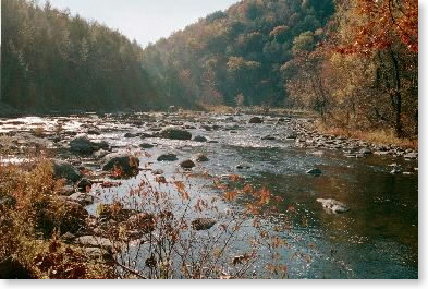 Long night, although sleeping bag was fine. Up about 6:00. Sunny and quite cold (about 20º) and some light snow on the ground. Water bottles pretty much frozen. Off at 8:00. Met Exodus, another southbounder, who had stayed at adjacent shelter, and hiked with him for the first hour or so. Up Mt. Everett in about half an hour. Good views. Weather cold and gray. Ledgy down, then up along long Mt. Race ridge. Very scenic ridgewalking. Past attractive Bear Rock Falls and down through woods to Sage's Ravine. Lots of oak color -- woods bright yellow. Had lunch here (1/2 hour). Nice walk along ravine then up steep ledges to Bear Mountain summit. Met parent of thru-hiker and companion, talked for a while, and yogied some cookies. Down through woods, walking through thick laurel understory. Stopped at Bond Lean-to about 2:30 and continued on to Riga Lean-to about 3:15. Very attractive view. Still cold and partly sunny. Shared lean-to with some Boy Scouts from Mass. Last night on trail.