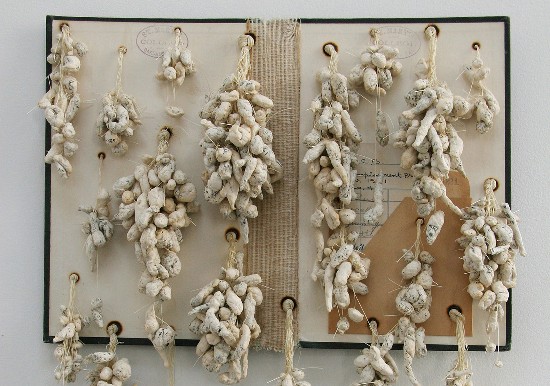 Altered Book 18 x 13 x 2 inches $5,100 Lisa Kokin created the button portraits that hang in your livingroom. These altered books are fabricated using the pages of the text which are soaked and wadded into balls, then strung together and suspended in the original binding. A box frame can be fabricated to prevent anyone from touching the work. |