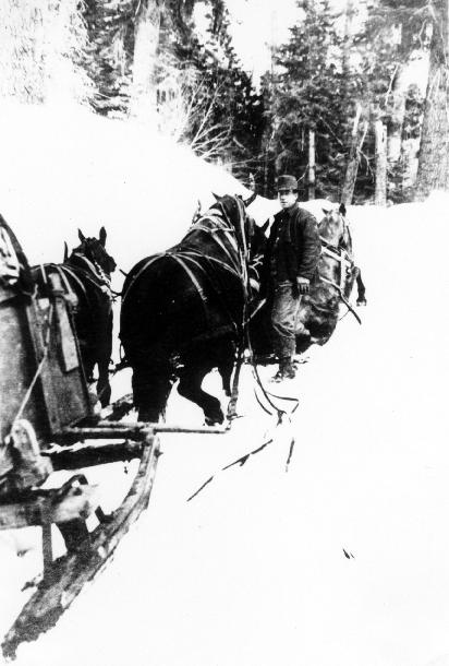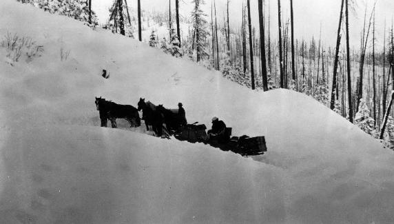 In cold winter weather, occasionally getting down to 10 or 20 degrees below zero, passengers sometimes took along coke foot warmers, or hot water bottles or hot rocks. Frequently, passengers not provided with such equipment walked about as much as they rode in order to keep warm. Drivers were usually pretty well prepared with layers of thick clothing with suitable footwear. In rainy or snowy weather, the passengers either provided themselves with rain wear and umbrellas or got soaked. Heavy winter snows presented the worst obstacles to keeping schedules. The first snows of the season were usually taken in stride, with wagons being used until enough snow covered the ground to accommodate the sleighs. But later in the winter, when overnight storms might deposit and drift several feet of the fluffy stuff over the old tracks, progress became very difficult. The horses would flounder, get off the beaten track and become entangled in the harness. Sometimes the driver and passengers would wade ahead for short distances, tramping paths for the horses. Horse snow shoes were also employed in some instances. These were wooden pads about 14 inches square and 2 inches thick. They were provided with holes into which the calks of the horses iron shoes would fit, and a curved iron strap which bolted around the toe of the horses hoof. Horses had to be trained in the use of these pads, but once a snowy road had been traversed with them, the road would be "broken" so that the horse snow-shoes could be dispensed with. So much for the background of the old road and it's accommodations. The Strongs and Argetsingers were probably only partially aware of what was ahead for them, but, once on the way, there was no turning back. As mentioned before, it had been a bad winter, and the snow was deep and menacingly drifted over the roads. A few details of the trip were frequently recalled by some of those participating in the journey. The first long day got them past Switchback all right, but only as far as Mountain House. At this point the snow was thirteen feet deep, and there was little evidence of the station buildings except parts of the roof and tall stove-pipes emitting wisps of blue smoke. Steps were cut in the ice and snow to get down to the floor level of the houses, and sloping ramps led into the stables, where the horses were reasonably comfortable. Just what sleeping accommodations were provided, and just how comfortably the young couple with the three-months-old baby spent the night was never revealed in detail. During that night considerable more snow fell and drifted across the road right-of-way. The next morning, as the four horse team with its loaded sleigh slowly crept around the precipitous slopes of Old Baldy, only the high blazes on the trees and the stage drivers intuition and knowledge of the terrain served to keep them on the proper course. In some places, where the narrow road had been graded around steep mountain sides, snow drifts had filled the excavations, leaving the curvature of the mountain sides appear unscratched. This, of course, caused the sleigh to tip precariously toward the down hill side. In fact, to prevent the stage from turning over and dragging the whole outfit down the mountain side, two men rode standing on the up-side sleigh runners. And, in order to free the mother's hands so that she might hang on to the seat at such an angle, the men held the baby in their arms as they rode on the sleigh runners. Under such conditions progress was miserably slow, and it was devastatingly cold. In places the lead horses would be breast deep in soft snow, and if their hooves, on penetrating the new layers of snow, did not meet the previously broken paths, they would sink through, flounder and thrash until calmed and gotten to their feet by the driver. |