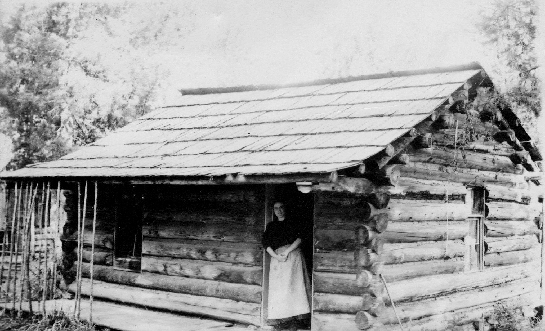 The first permanent residence of the Strong Family. Note hop vines growing over the porch to provide shade. (About 1908) |