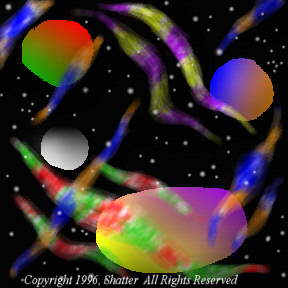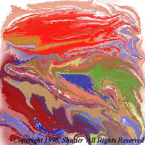 These were the first assignments for the class. The object was to create three pictures: warm colors, cool colors and one using complement colors. I started with the cool colors, using the illusion of flame, but giving a cold feeling. Next I completed warm. Initially, I had wanted to do ice, but couldn't figure an easy way to draw it, so I made a bubbling, frothing, steaming glob of stuff. For the complement piece I used complement gradients as well as cloned stripes for the ribbons. I thing Start Trek: Generations was on my mind -- the whole space ribbon thing.