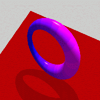 | A nice phong shaded torus with shadows. The torus was created using a script that produces the faceted polygonal representation of the torus given the radius, number of facets etc. The colors are artificially varied from blue to pink. The shadow algorithm uses a variant of the RenderMAN algorithm (used on the SGI's) which basically produces the shadow by placing the eye at the light source and generating a shadow map (Williams78). The shadow is then improved by doing local antialiasing (Reeves87). |
