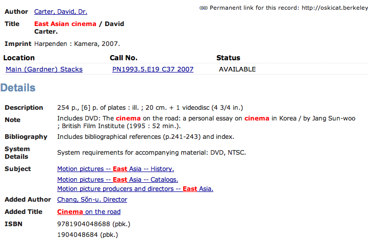 - We have a strong film studies department. Expect the library to have interesting books on specific directors, "Asian films", etc. This should be your solution to getting past all the web sites of dubious quality that are about Asian films. (The other topics: cultural, psychology of love, etc. are easier to research using traditional research methods such as JSTOR and so on.) Here's an example (and note the subject heading you could click on to find more resources):