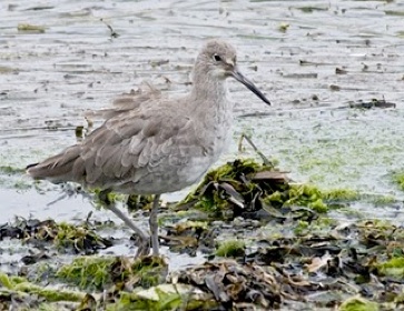 Typical Species: Near the water's edge: Willet, Whimbrel, Western Sandpiper, Least Sandpiper, Marbled Godwit, Black Turnstone, Ruddy Turnstone, Great Blue Heron, Snowy Egret, Double-crested Cormorant, Western Gull, Ring-billed Gull, California Gull, Pied-billed Grebe, Western Grebe, Brown Pelican. Further out, loons, scoters, and other ocean-going ducks are frequently present, Pelagic Cormorant, Bufflehead, Greater Scaup, American Coot. Brant in the winter. In the parking lot area, House Sparrow, Brewer's blackbird, American Crow, and European Starling are common. Gulls like to hang out on the roof of the main building and other buildings in the area. Large flocks of the smaller sandpiper species often collect along the rocks that project out into the water here (see photo).