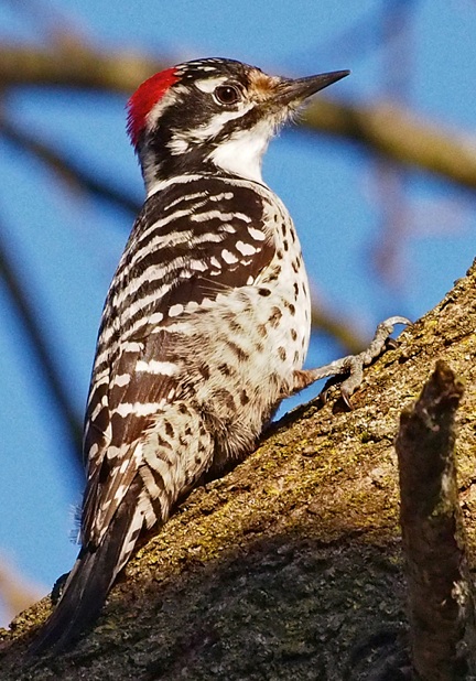 For comparison: Nuttall’s Woodpecker (male), Hewitt St., Santa Rosa, January 30, 2013 Note ladder-like striping on back rather than a single vertical stripe of white; also, black spotting on flanks and lower belly