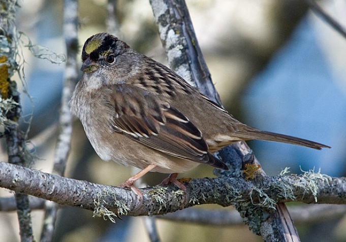 Usually identified by the golden crown, but we rarely see this bird in full breeding plumage, so pictures in field guides are often more confusing than helpful, especially to beginning birders. We mostly see winter birds in which the gold crown is often an attenuated brownish-yellow, sometimes barely visible (although there is usually some suggestion of yellow on the top of the head) flanked by dark brown--field guides often show the flanking color as a rich black. Only birds in full breeding plumage will have the starkly striped (black-yellow-black) look often shown. From the side, no yellow or gold may be visible on the head at all on birds wintering here. Most Golden-crowned Sparrows will be well north of Sonoma County when sporting such bright colors (but not all--see below).