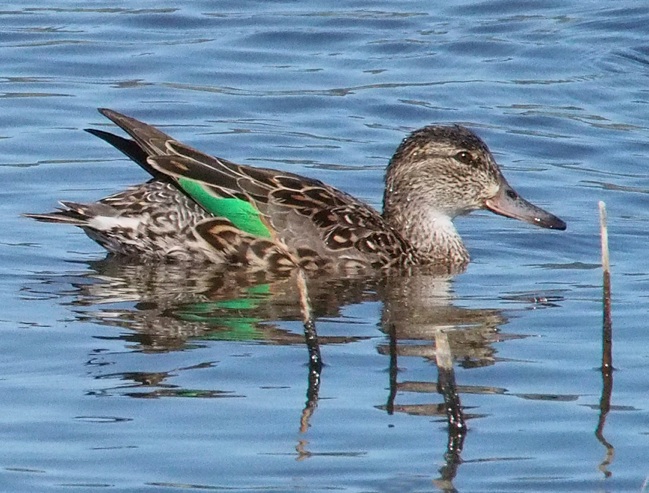 Notably small, at about 14 inches (35.6cm) head to toe, or about half the size of a Northern Pintail (Anas acuta). Males are hard to mistake for anything else. Look for the rufous face marked with a broad slash of rich green around and behind the eye. Fine white line under the green area, often most obvious under the dark eye. Bill black. Looks mostly plain grey above, but at close quarters the fine patterning on the flanks should be apparent and the breast is a pale, creamy color with dark speckling. Note the vertical white stripe near the front of the bird (lacking in the Eurasian subspecies A. crecca crecca, most birds in North America are A. crecca carolinensis the bird pictured here). A black lateral stripe may or may not be visible, depending on how the wings are tucked. Black at the rear but with a prominent creamy white patch above the black. Females are more challenging, but the green in the wing may show (photo below), revealing the bird’s identity. Distinguished from other female teals by its smaller size and by its grey bill, which is thinner as well. Variable dark eyeline. Note the pale area below the tail in female Green-winged Teal, contrasting with the darker, heavily scalloped back and flanks. Lacks the extensive pale area at the base of the bill and chin of female Blue-winged Teal (Anas discors). In flight, look for a green and black speculum bordered by cream in front, white in back. Pale to white in center of underwing. Fast, nimbly turning flight in tight flocks may suggest a shorebird.