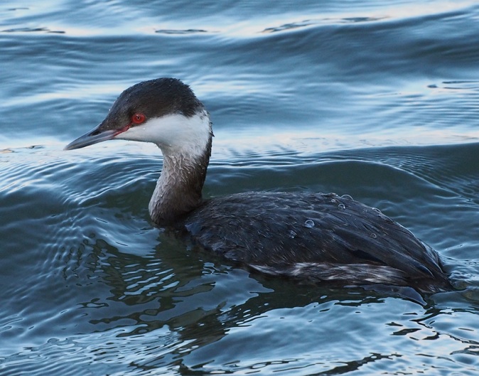 In Sonoma County, we mostly see Horned Grebe and the somewhat similar-looking Eared Grebe (Podiceps nigricollis) in drab winter, or non-breeding, plumage. In winter plumage (as above), Horned Grebe is dark grey on top but pale below (from a little above the water line down). The foreneck, chin, and side of the face are white with the white extending toward the back of the neck. The back of the neck, the nape, and crown are dark, like the back. Bright red eye in all plumages, but the eye may be brighter in breeding season. The bill is comparatively short and stout for a grebe, but not at all like the fat, chunky bill of Pied-billed Grebe (Podilymbus podiceps). The bill is usually dark, usually with a whitish tip, but the tip color can be very hard to see in the field. Subtly paler in front of the eye, but this light spot, too, can be very hard to see, except at close range, and on some birds it is not prominent. Neck shade in winter plumage is variable; some birds have considerable grey on the upper part of the neck.