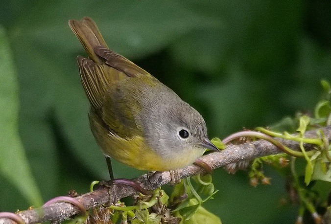 For comparison: Orange-crowned Warbler--One of the grey-headed subspecies. This is the bird mostly likely to be confused with Nashville Warbler, but note the broken eyering and the faint eyeline here.