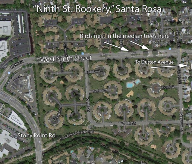 Access: Can be approached from Stony Point Rd. or from North Dutton Ave. The rookery trees are closer to Stony Point Rd. than to Dutton. On-street parking.