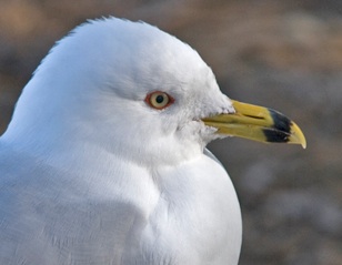 Adult Ring-billed Gull: Winter plumage, but beginning to show hint of red orbital ring of breeding plumage above the eye; pale iris; comparatively straight, light bill; black ring on bill; streaked head typical of winter birds