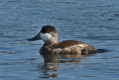 The male Ruddy Duck is striking in breeding plumage--when he's at his ruddiest. The black cap; white face; bright blue, flat, rather heavy bill; and stiff, wiry tail are distinctive. Common in Sonoma County (in non-breeding plumage) during the winter months. Ruddy Ducks usually start arriving in the middle of September to early October. Numbers thin rapidly from around the middle of the following May. A small number may stay over the summer, but generally not much seen here in June, July, and August. There is, however, a small breeding population in the county. Breeding records exist for Annadel State Park and the southern extreme of the county, near San Pablo Bay, according to the Breeding Bird Atlas. May be found in salt water (where it favors protected bays and estuaries) but also in brackish water and freshwater ponds. Not uncommon inland on farm ponds and water treatment ponds. Tends to stay in loose flocks. Often content to spend longs periods simply floating with a tucked head. Almost never seen on land--Ruddy Ducks are said to be barely capable of walking. Noted as a brood parasite (targeting Redheads, and Canvasbacks, especially, but also grebes, and rails, although Ruddy Ducks apparently more often slip eggs into the nests of fellow Ruddy Ducks than into the nests of other species, according to The Birder's Handbook).