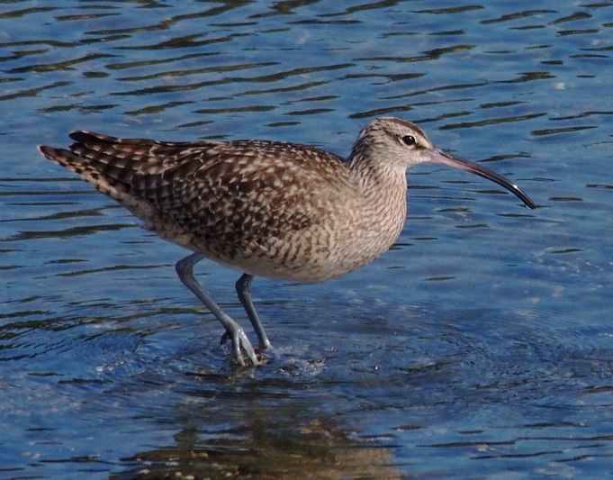 Distinguished by its large size, long, decurved bill, boldly striped head pattern, and bluish-grey legs. Not likely to be confused with any other bird, except perhaps the related Long-billed Curlew (Numenius americanus), which is larger, more warmly colored (buff or almost cinnamon below and under the wings where Whimbrel is more grey), with an even longer (almost ludicrously long) bill. Whimbrel is not especially common in Sonoma County, but it’s seen here more often than Long-billed Curlew. Marbled Godwit, another vaguely similar (and much more common) bird, is about the same size as Whimbrel, but has a very clearly two-toned bill (Whimbrel may show some reddishness at the base of the bill, but never the distinct red and brown of the Godwit’s bill), which curves up slightly, rather than down. Like Long-billed Curlew, Marbled Godwit generally will appear warmer in tone than Whimbrel, especially when seen in flight with the underwings visible.