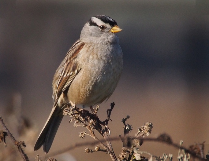 Usually easily recognized by its black-and-white striped crown and yellowish bill. As in the case of Golden-crowned Sparrow, pictures in field guides can be confusing, especially to beginning birders in Sonoma County, because guides often show birds in full breeding plumage and often do not show our Nuttall's race. Our birds are somewhat browner on the breast and flanks than the idealized forms often depicted, and the white striping on the head is usually duller (however, birds with the starkly black-and-white striped heads--suggestive of those old-fashioned leather helmets worn by bicycle racers--are present). From the side, the white stripe at the top of the crown is often not visible, which may give the bird a black-capped look. Otherwise, white-crowned Sparrow is a fairly large sparrow with a comparatively long tail; tweedy brown striped back (like Golden-crowned Sparrow); grey nape; pale grey to pale brownish throat, breast, belly, and flanks; two indistinct, often spotty, whitish or pale wing bars; yellow to orange bill (pinkish--almost terra cotta-colored--in some juveniles); and longish pink legs. First few notes of the song are similar to Golden-crowned Sparrow--a clear, plaintive, low whistling--but these are followed by buzzy, trilled notes.