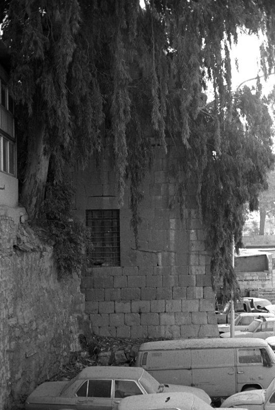 The northwest corner has been bevelled, the top of the cutoff being curved but without any muqarnas cell. Beyond the cutoff on the west side the finish turns immediately to pick-facing until ashlars give way to smaller quarry-faced stones; this masonry continues down to the southwest corner quoins, to which several ashlars were added in each course. These quoins are hammer-dressed.