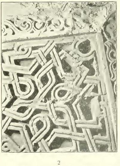 The left [southeastern square] has as main motif an eight-pointed star formed of two crossed squares, the alternate points being connected by loops with four circles which just touch the circumscribed square. These four circles are also connected by loops with a smaller central circle, outside which is a four-lobed motif. The grooved bands which form all these motifs pass under and over each other alternately. The decoration of the outer border is similar to that on the soffit of the left hood [niche head]. The right-hand [northwestern] panel is filled with a design which also develops from a central eight-pointed star.
