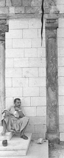 When built the entrance block appeared taller than today because the ground level was lower. According to Creswell the projecting molding just visible in Figure 4 at the level of the exterior pavement of 1983 is half-round; he called it a “socle”. It has been rebuilt to run all the way around the block except for the opening to the passage. But Creswell, who was able to observe it only on the northeast side of the entrance block, did not show it in his bird's-eye reconstruction (fig. 44), in which nine steps are restored. He estimated the difference between the ground level when he wrote (apparently about the same as in 1983) and that of the time of construction as two meters.153 It is possible that some feature or articulation of the masonry below the half-round molding gave this basement zone the appearance of somehow supporting the niched zone above it.