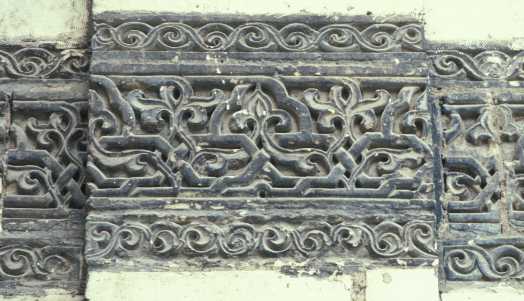 In the main entrance the ornament consists of squares rotated 45° within the shallow niches, and above them a cornice, a frieze (as Flury called it), another cornice, niche heads, their borders, and a border that may have run around the zone above the springing of the niche heads and may have been coupled with an epigraphic border. The minor entries of the northwestern facade had door frames distinguished by moldings but not carving. The ornament of the minarets includes borders, moldings, round medallions, horizontal bands (both applied and as what Creswell called a cresting), window frames, the fillings of spandrels adjacent to niche heads, and an inset panel set above a doorway.