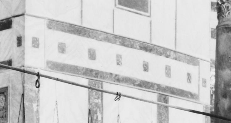 As the scroll frieze replaces an Umayyad original, the marble revetment of the spandrel zone between it and the ablaq arches below, and the arches themselves, must have been revetted in marble originally; they probably were restored under Sulaymān as well. What is visible in the American Colony photographs may be an even later restoration. But it probably preserves the original scheme, at least in outline.