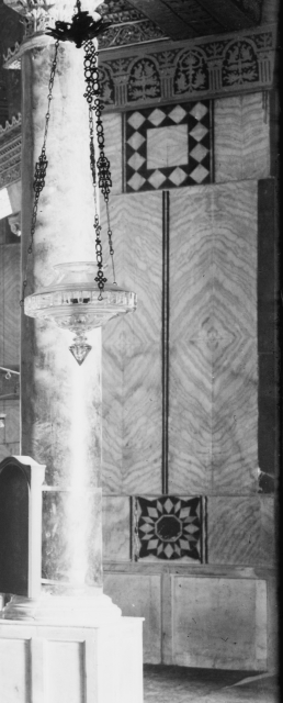 A photograph published in the Ordnance Survey of Jerusalem was of course taken before its publication in 1865, but likely not long before.6 It is a view to the west between the two arcades, inside the south entrance, with Pier 8 partly visible behind several chandeliers (cf. 06639u and 11793u, with later chandeliers). This location would have been appealing to an early photographer looking for a representative view of the interior, as opening the south doors would have provided more light than was available elsewhere, and early photography required strong light (possibly, too, these doors were most commonly left open, as they face the Aqṣā Mosque). This photograph shows nothing different from the American Colony photographs regarding the piers, and provides no otherwise missing detail of them.7