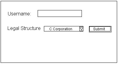 "We want a page with a form where we can enter the name of an existing user in a textfield and a legal structure from a pulldown. We will retrieve the legal structure pulldown entries from the database (we can't just put them into html). It should look something like this."