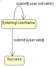 The balloons indicate states, and the arrows indicate transitions between states. Note that the EnteringUserName state has a state transition that leads back to the same state--if the username isn't valid, it sends you back into the same state (with appropriate error messages). Please make sure that everyone (you, the Java developer, the spec writer) agree on the state model!