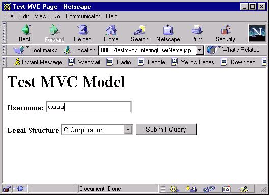 "We want a page with a form where we can enter the name of an existing user in a textfield and a legal structure from a pulldown.  We will retrieve the legal structure pulldown entries from the database (we can't just put them into html).  It should look something like this."