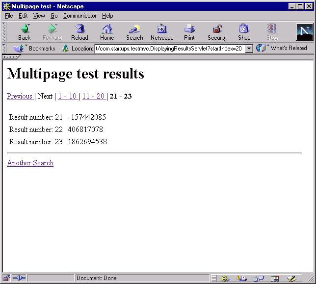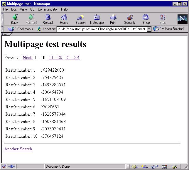 // Generate numbered links 1 - 10 | 11 - 20 | etc.The last part of the jsp simply loops through the currently displayed indices and prints out up to 10 results on the page:
