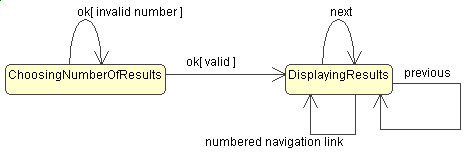 /*SessionValidControllerServlet extends ControllerServlet and adds session expiration checking--it checks that the session has not expired before letting subclasses do their work (see the javadoc for SessionValidControllerServlet for more info). The reason why we need this is because the DisplayingResults state spans multiple pages. Since a user can leave his or her browser after seeing any page, the session may expire. Since the session contains the model, subsequent requests will fail with a nasty error. SessionValidControllerServlet checks for this condition and redirects the user to an error page if the session has expired. The use of SessionValidControllerServlet leads to another difference from our previous example in the next few lines of code: