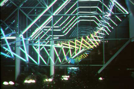 Microprocessor controlled argon & mercury vapor filled glass tubes within sandblasted Lexan sleeves. Suspended above the main interior atrium, it is the focal point of a busy Lobby, Restaurant and Bar. | ||