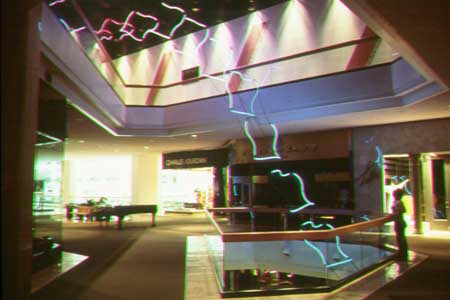 Polyolefin covered, hand painted "neon". Sculpture is suspended through 3 floors, computer controlled via low voltage DC address: all logic in "firmware".
