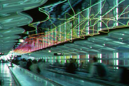 23,600 sq. ft. of mirror reflecting over 1 mile of "neon", (all impact protected by a spray coated, transparent rubber) controlled by 3 solid state computers. I hour of electronic music, commissioned for specially fabricated CD sound system. Sculpture envelopes passengers en route to and from flight gates between concourses B & C at Chicago's O'Hare International Airport, United Airlines, Terminal 1. | ||