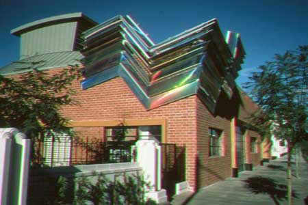 8 components each 6'W x 8'H, all supporting 7 blades @ 18" x 10', all constructed on each wall one above another in increasing 15° increments. These blades are fabricated from 3/16" Implex, over laminated with a mirrorized bidirectional diffraction grating which reflect rainbows, day and night, in different hues, wrapping around upper corner, at building's entrance. | ||