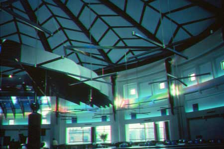 A mirrorized holographic collar, sited directly beneath clear skylight. Spectral iridescence is reflected off collar, splashing rainbows throughout interior.
