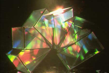 Six interconnected acrylic equilateral units form the sculpture, which is set upon a mirror base. Holographic diffraction grating creates luminous color over the surfaces of the sculpture, especially in Sunlight! | ||