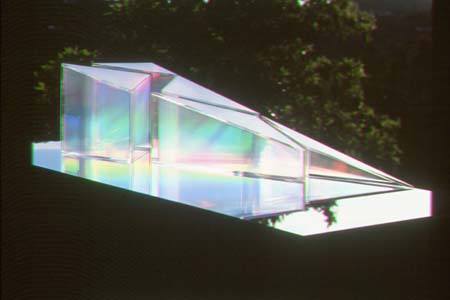 Holographically etched acrylic forms on a mirrorized base. A truncated triangular right angled pyramid that is comprised of 5 enclosed, spectral acrylic components.