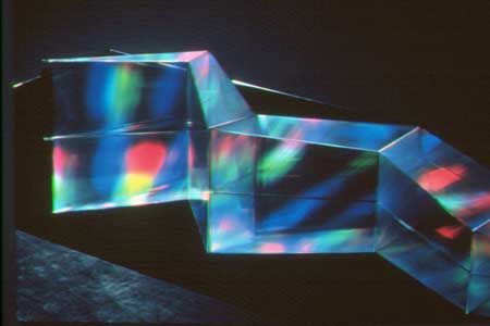 Holographically imprinted 1/8" clear acrylic and 1/4" acrylic mirror. A wall mounted piece in which the reflection of the real acrylic component that comprises the sculpture's fore-ground and the vertical image of it, reflected in the mirror, create the sculptures 'real' & 'virtual' likeness | ||