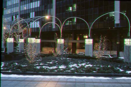 Eight arches of 1/2" rigid organic, side dedicated fiber optic, each with eight 30' long sections. Both ends of each arch are addressed by metal halide illuminator with color wheel controlled hue variations. | ||