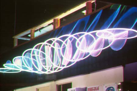 Organic fiber optic, mirrorized acrylic, with high-frequency unidirectional and bidirectional holographic diffraction gratings. Changing colors within 10 hoops of large diameter fiber optic are diffracted into their multiple constituents. | ||