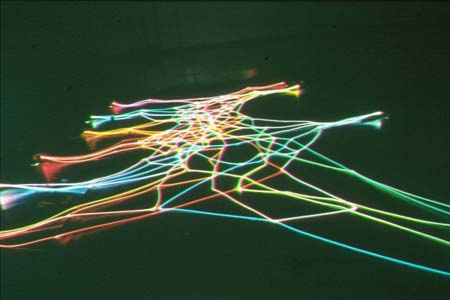 1,000 feet of 1/2'' solid core, organic, side dedicated fiber optic, illuminated by 10 x150 watt metal halide illuminators, each chromatically controlled by Dichroic glass color wheels. This ever changing"Lumetric" human scaled Spider Web is suspended above the pedestrian entry to the "SPIDERS" exhibition, that toured North America's Natural History Museums. | ||