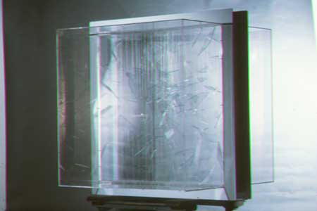 Laser drilled shards of plate glass, suspended on stainless steel cable, supported by a structural steel frame painted sky blue. This piece is a metaphor for an emotional outburst.