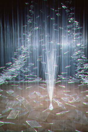 Squares of polished acrylic suspended on monofilament line and anchored into the carpeting of the gallery. Created as the central exhibit in this exhibition, the lights and colors or adjacent works reflect in the polished acrylic suspended units. | ||