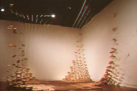 Construction off-cuts, split & suspended on monofilament line. Elements for this installation were calculated using values from the Richter Scale from 4.5 to 7.0. Viewers walk around and through the piece.