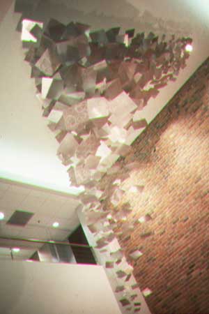 Aluminum components are "scribbled" on and coated with a high gloss epoxy, suspended & rigged with stainless steel cable and hardware. Created for an entrance lobby of an office building in San Francisco.