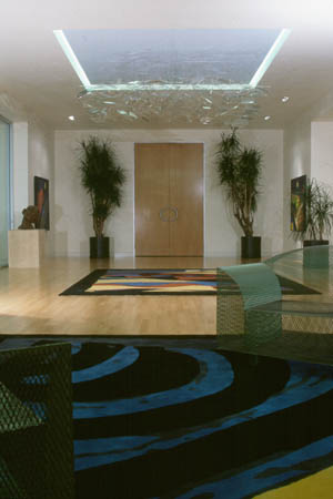 Laser drilled glass shards and polished acrylic suspended on flourescent monofilament line. The sculpture is installed in the entrance lobby of Next Level Communication Company, Rohnert Park, CA.